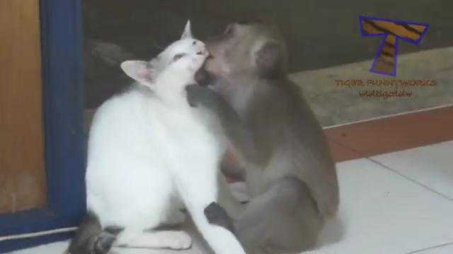 Cười vỡ bụng clip khỉ cưỡng hôn mèo