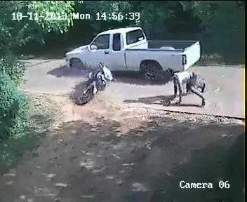 Sau cú va chạm như trời giáng với xe tải trắng, xe máy ngã kềnh thảm hại còn chủ nhân của nó thì tung người trên không rồi đáp đất một cách đầy "duyên dáng".