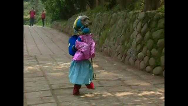 Một chú chó ở Trung Quốc được chủ huấn luyện đi bằng 2 chân sau và mặc quần áo như người.