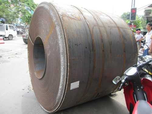| Cuộn thép nặng hàng chục tấn sau khi xô bẹp đầu xe tải và lăn xuống đường |