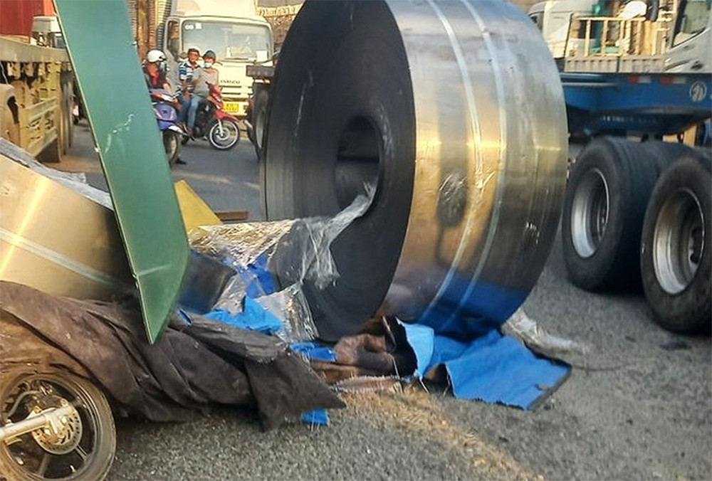 Cuộn thép rơi từ xe đầu kéo, đè bẹp xe máy ở Bình Dương ngày 23/1. Hai thanh niên đi xe máy thoát chết do nhảy ra kịp thời. (Ảnh: Tiền Phong)