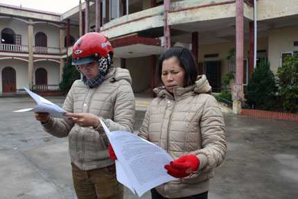 | Bà Thương, bà Hiền đang xem bản kết luận của Cơ quan CSĐT giao tại trụ sở UBND xã Vinh Quang - Ảnh Minh Khang |