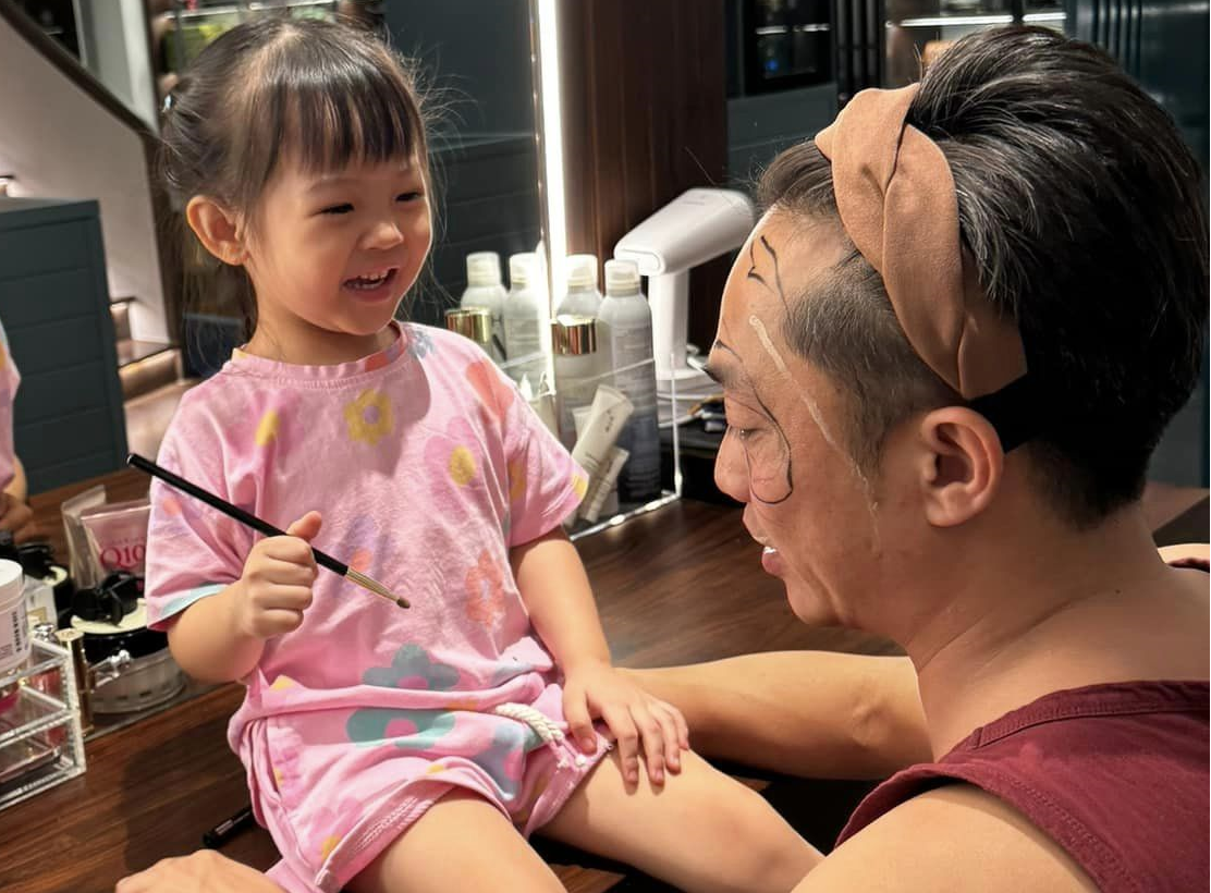Chia sẻ trên trang cá nhân, doanh nhân Cường Đô la đăng tải loạt ảnh anh vui vẻ chơi đùa cùng 2 con nhỏ. Nam doanh nhân thoải mái cài tóc bằng chiếc bờm của bà xã rồi ngồi để con gái Suchin vẽ đầy mặt.