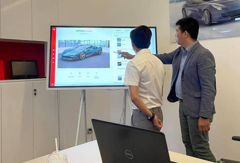Hình ảnh đại gia Cường Đô la được nhân viên bán hàng tư vấn lựa chọn đặt mua Ferrari SF90 Stradale hồi tháng 4/2021. (Ảnh: FBNV)