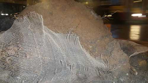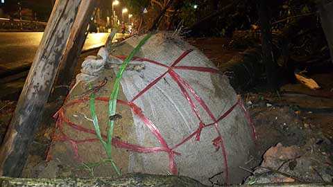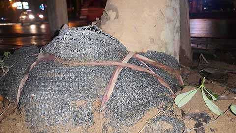 | Các gốc cây mới được trồng trên phố Lê Duẩn, khi bật gốc để lộ ra nguyên một bọc vẫn được buộc chằng. |