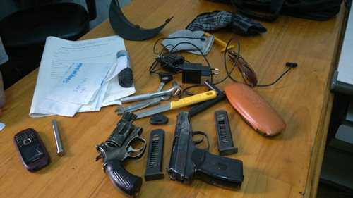| Hung khí và dụng cụ mở khóa xe của 2 tên cướp bị thu giữ tại công an |