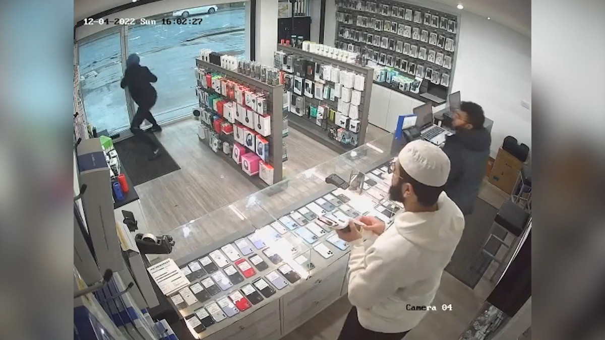 Tên cướp vào cửa hàng ở Tây Yorkshire, Vương quốc Anh lấy 2 chiếc điện thoại bỏ chạy nhưng người chủ đã nhanh trí khóa cửa không cho hắn ra ngoài.