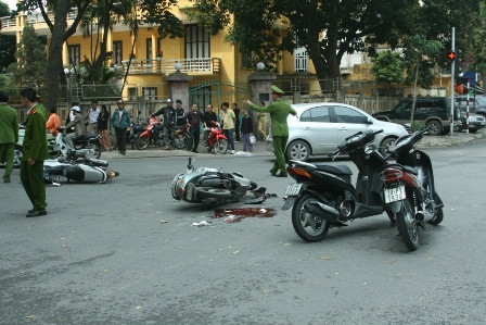 Theo sau hai người này có nhiều người đang phóng xe đuổi theo. Khi bị truy đuổi đến ngã tư Trần Bình Trọng – Nguyễn Du thì đâm vào một chiếc xe máy mang BKS 29X8 – 5762 chạy cùng chiều.