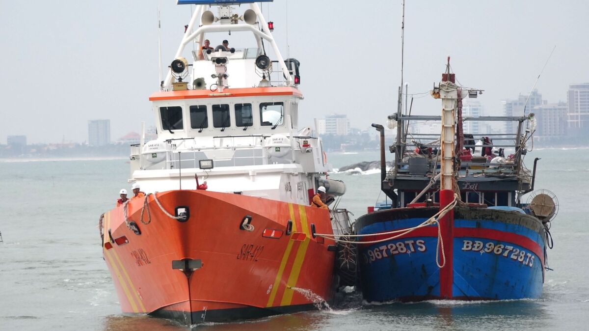Tàu SAR 412 lai dắt tàu cá của ngư dân Bình Định về Đà Nẵng an toàn.
