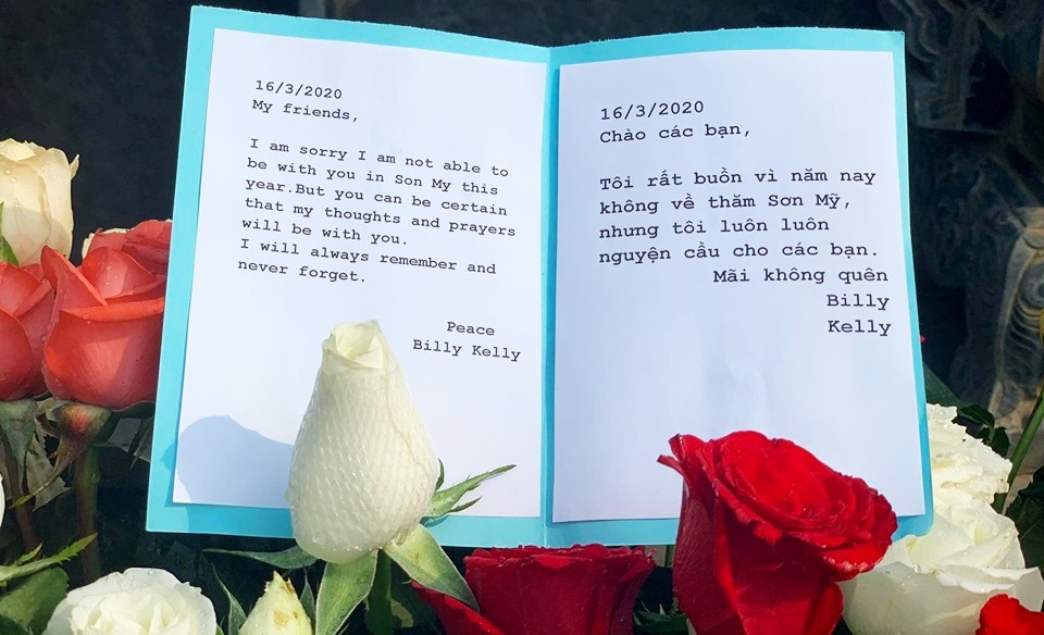 Năm nay, dù không thể sang tham dự, ông Billy Kelly - cựu binh Mỹ từng tham chiến tại Việt Nam, vẫn gửi 504 đóa hoa hồng dâng lên 504 thường dân Sơn Mỹ bị sát hại kèm theo tấm bưu thiếp với nội dung: “Tôi rất buồn vì năm nay không về thăm Sơn Mỹ, nhưng tôi luôn luôn cầu nguyện cho các bạn. Mãi mãi không quên”.