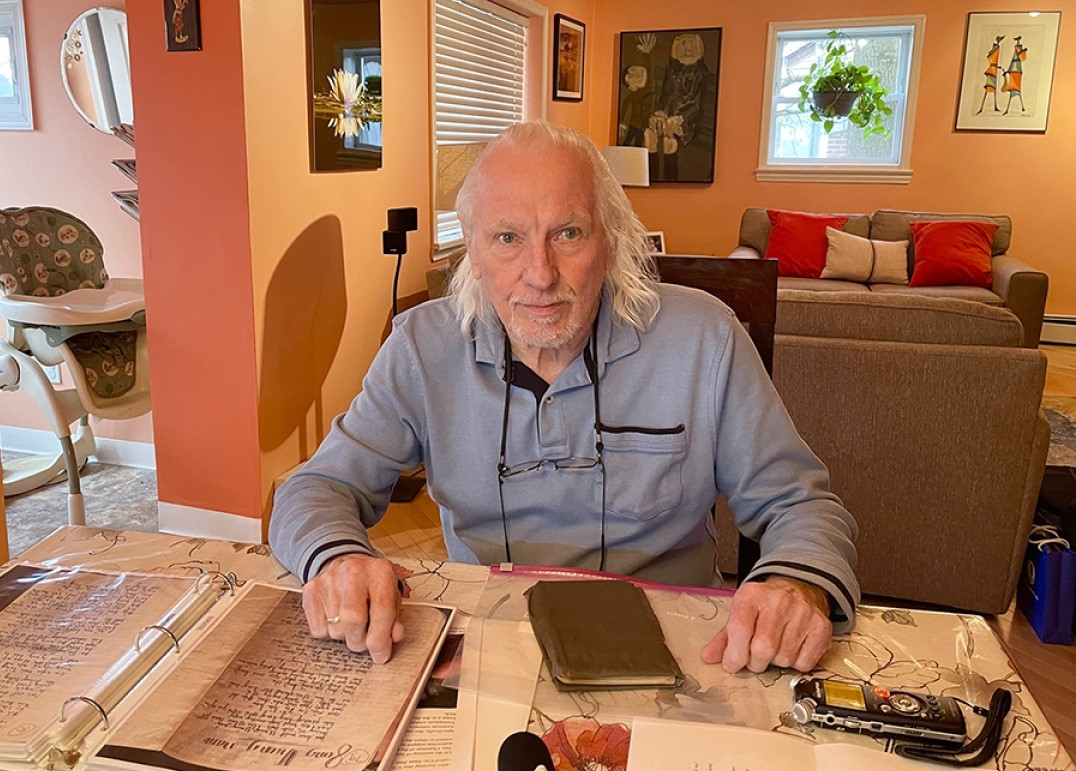 Ông Peter cùng cuốn sổ tay và những bài báo, thông tin liên quan tại nhà riêng.