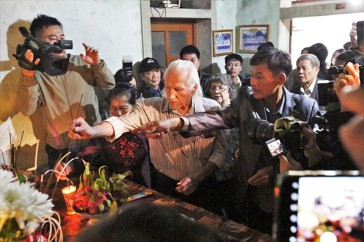 Tại nhà ông Mỳ, ông Mathews đã mang món quà đặc biệt là hộp hoa hồng khô cùng cuốn sổ ghi chép dâng lên bàn thờ liệt sĩ Cao Văn Tuất.