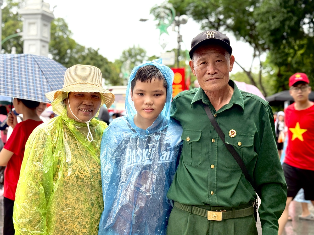 “Ở lại qua lễ mùng 2/9 rồi mới về. Mệt thì mệt, nhưng được tận mắt nhìn thấy khí thế này, thấy cờ đỏ sao vàng tung bay, tôi thấy xứng đáng”, ông cười, nước mưa lăn dài trên gương mặt.