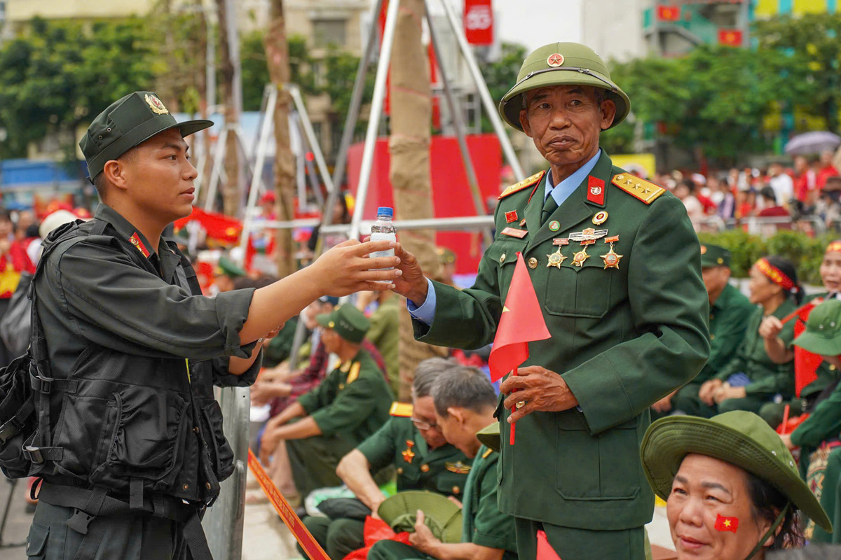 Trong đám đông ấy, rất nhiều cựu chiến binh có mặt. Trên ngực là những tấm huân chương, họ được người trẻ nhường lối đi trước. Dù vậy, do lượng người quá đông, nhiều cựu chiến binh đành đứng lẫn trong dòng người.