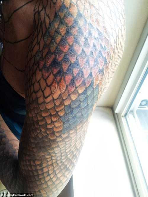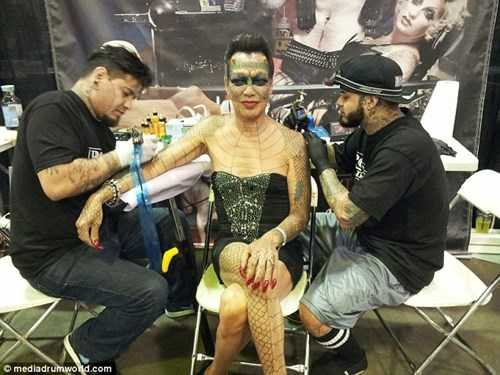 | Tiamat xăm hình vảy rồng lên cơ thể ở New York. |