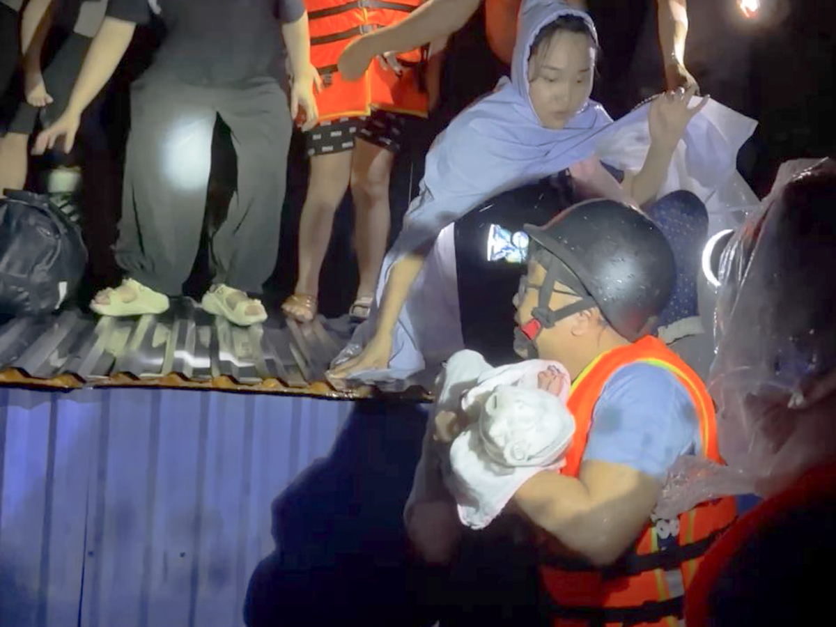 Đoàn cứu hộ kịp thời đưa bé 2 tháng tuổi trên nóc nhà về nơi an toàn. (Ảnh: NVCC)