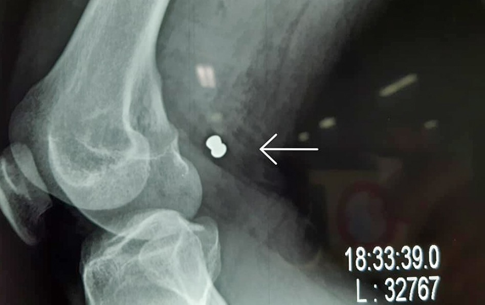 Viên đạn găm vào đùi phải của anh H. (Ảnh: Bệnh viện cung cấp)