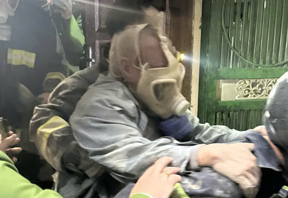 Ông lão được cảnh sát đưa ra khỏi đám cháy.