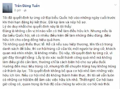 Từ đêm qua, cư dân mạng xã hội Facebook xôn xao trước thông tin ông Trần Đăng Tuấn quyết định tự ứng cử Đại biểu Quốc hội.