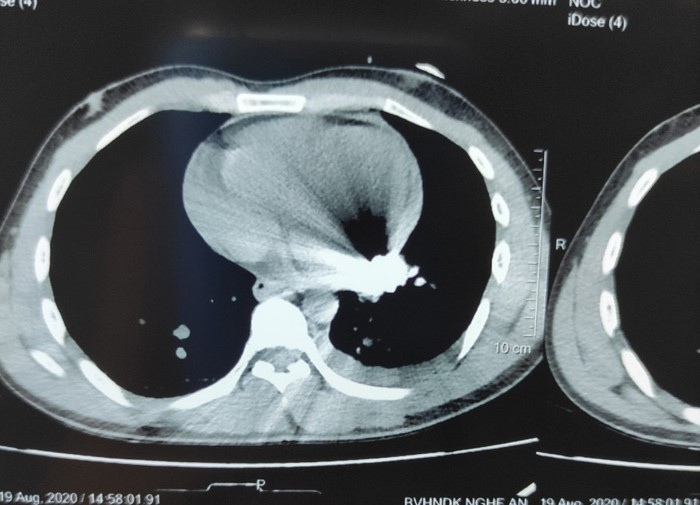 Tiến hành siêu âm, các bác sĩ phát hiện tràn dịch màng tim, dịch màng phổi trái. Chụp cắt lớp vi tính, họ phát hiện thêm dị vật kim khí nằm trong màng ngoài tim ở thành sau tâm thất trái.