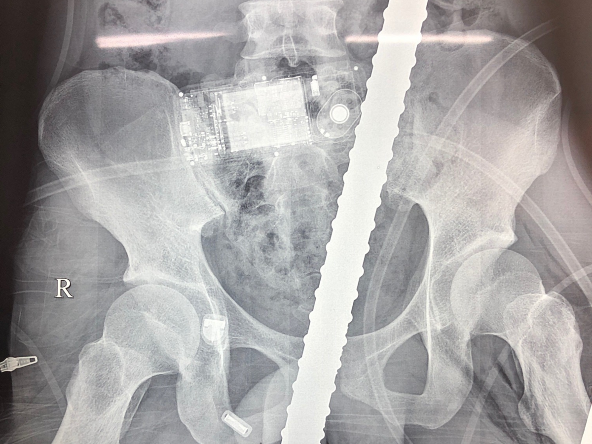 Hình ảnh X-Quang thanh sắt đâm xuyên từ đùi lên bụng bệnh nhân.