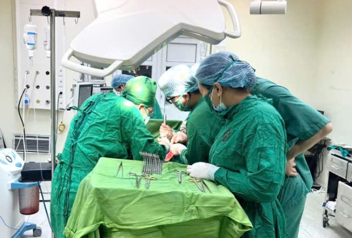 Trước tình trạng khẩn cấp, ê kíp hội chẩn nhanh và quyết định phẫu thuật cấp cứu. Trong quá trình mổ, bác sĩ ghi nhận ổ bụng có khoảng 1.400 ml máu loãng lẫn máu cục, đồng thời phát hiện lách bị vỡ đang tiếp tục chảy máu.