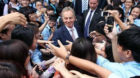 | Cựu thủ tướng Anh Tony Blair trong sự chào đón nồng nhiệt của các sinh viên tại Học viện Ngoại giao - Ảnh: Việt Dũng |