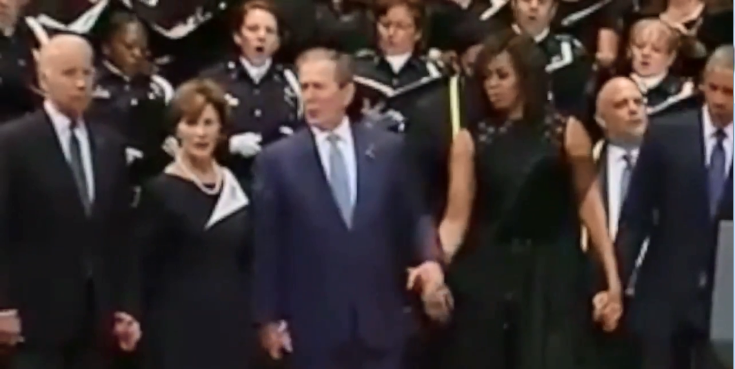 Có vẻ như bị cuốn theo nhịp của "The Battle Hymn of the Republic", cựu Tổng thống Mỹ tỏ ra khá vui vẻ khi nhún nhảy theo lời nhạc mà quên mất rằng mình đang tham gia buổi lễ tưởng niệm đau buồn này.