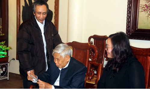 Ông Hàn Đức Long (đứng) bày tỏ sự cảm ơn sâu sắc nguyên Tổng Bí thư Lê Khả Phiêu - Ảnh: Phapluatplus