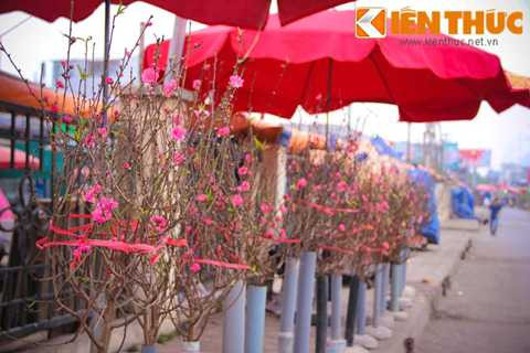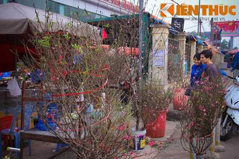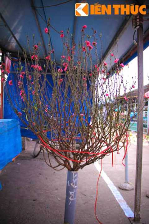 | Hầu hết đào bán tại chợ đều đã bung nở hoa khá đẹp mắt. Theo chị Hoa, một người bán hàng tại đây cho biết: "Những cành nhỏ để cắm ban thờ, tán tròn và đẹp bao giờ cũng bán chạy hơn cả". |