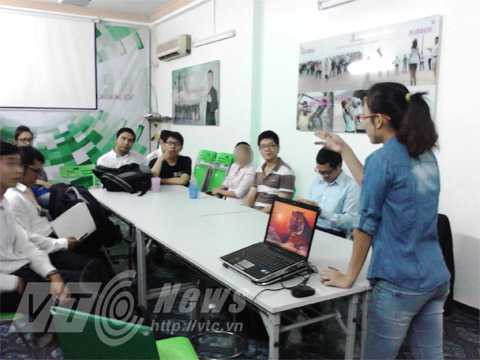 | Nhân viên Phương Đài (đứng áo xanh) đang "thẩm tra" những nhân viên cũ đến công ty theo lịch hẹn trước với "ông chủ" Lê Chí Linh. Ảnh: Phan Cường |