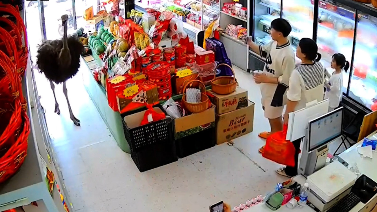 Con đà điểu bất ngờ xuất hiện trên đường phố tại Triệu Khánh (Quảng Đông, Trung Quốc) rồi thản nhiên xông vào cửa hàng tiện lợi khiến người mua hàng ngạc nhiên.