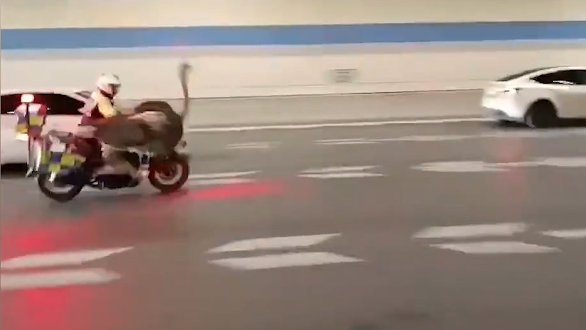 Đà điểu va chạm với một cảnh sát sau khi bị truy đuổi trên đường cao tốc trong giờ cao điểm tại TP Trịnh Châu (Hà Nam, Trung Quốc).