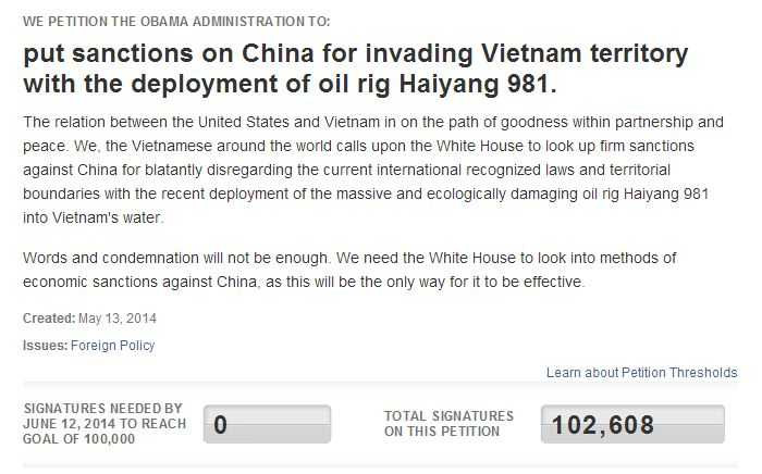 Ngày 13/5, trên website của Nhà Trắng xuất hiện bản kiến nghị yêu cầu chính quyền Obama trừng phạt Trung Quốc về việc nước này hạ đặt giàn khoan Hải Dương 981 trái phép tại vùng đặc quyền kinh tế và thềm lục địa của Việt Nam.