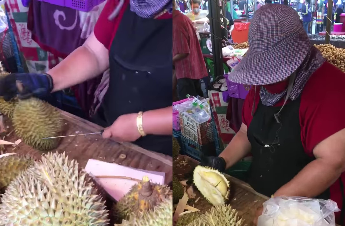Đôi tay thoăn thoắt tách sầu riêng của chị bán hàng khiến nhiều người thích thú.
