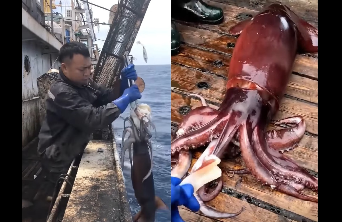Những con mực khổng lồ lần lượt được các ngư dân kéo lên, nhìn mà ham.