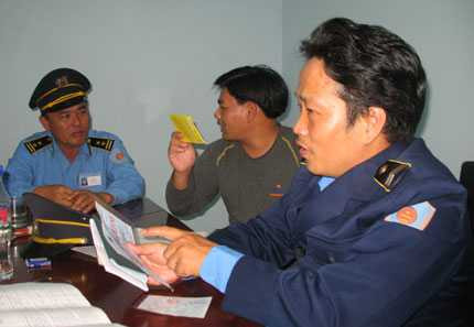 | Lực lượng Thanh tra giao thông Sở Giao thông vận tải Đà Nẵng làm việc với tài xế (người ngồi giữa) vi phạm |