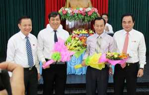 | Bí thư Thành ủy Đà Nẵng Trần Thọ và Chủ tịch UBND TP Đà Nẵng Văn Hữu Chiến chúc mừng ông Huỳnh Đức Thơ và ông Nguyễn Xuân Anh trong vị trí công tác mới |