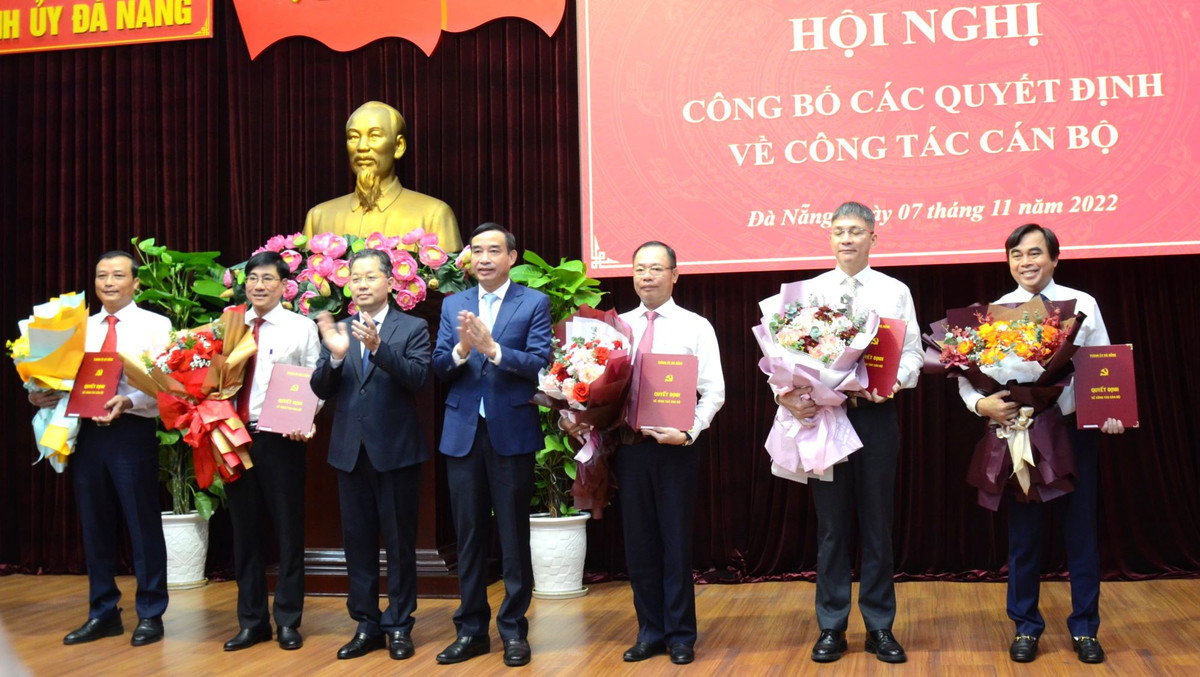 Lãnh đạo thành phố Đà Nẵng trao quyết định, tặng hoa các cán bộ được điều động, bổ nhiệm.
