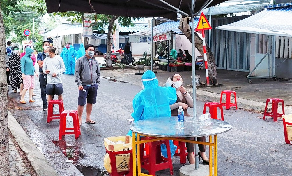 Lấy mẫu xét nghiệm COVID-19 cho người dân tại khu chung cư trên địa bàn phường Nại Hiên Đông, quận Sơn Trà, Đà Nẵng.