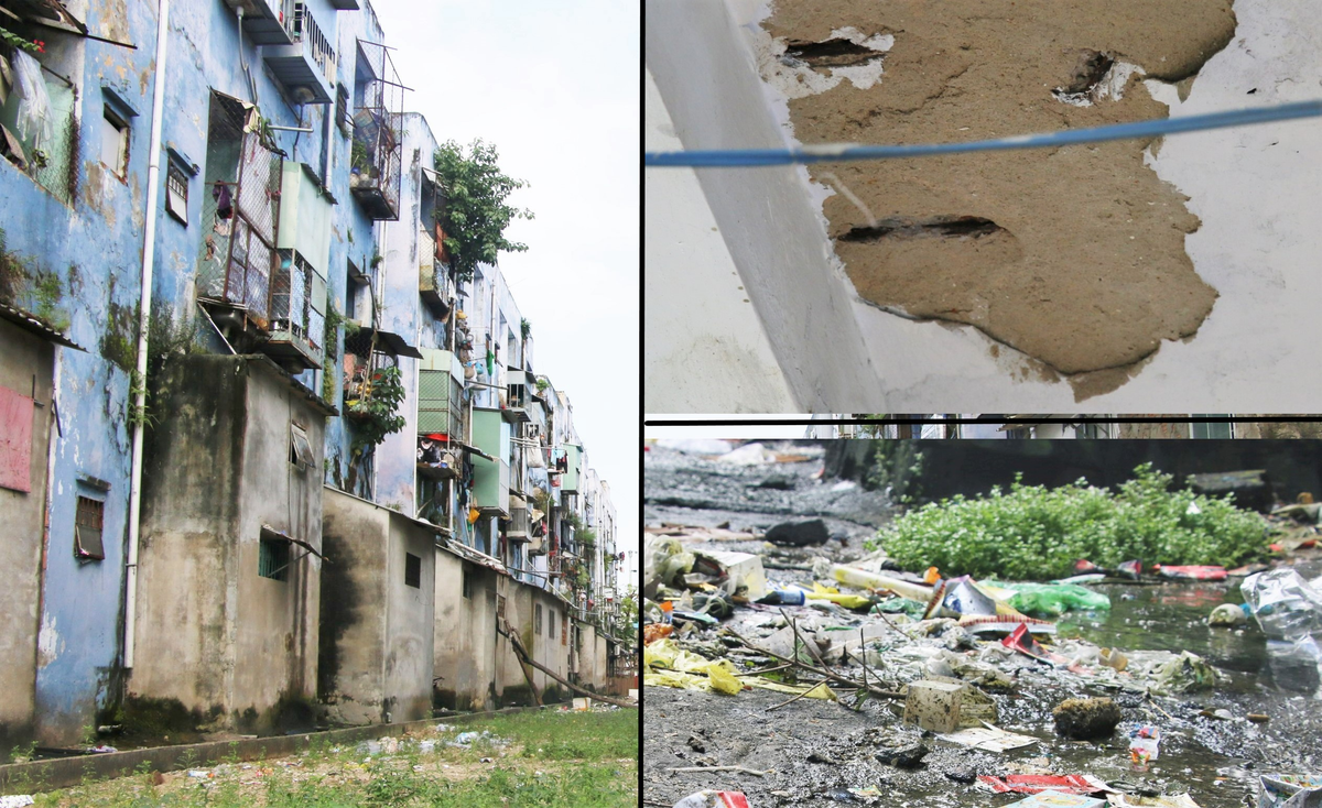 Không chỉ nhà cửa xuống cấp, các khu chung cư này còn rất nhếch nhác, rác thải chất đống phía ngoài, môi trường ô nhiễm.