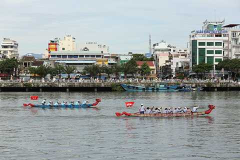 (VTC News) - Trong khuôn khổ sự kiện chào mừng Quốc khánh 2/9, sáng 2/9, hàng ngàn du khách và người dân Đà Nẵng đã háo hức đứng dọc 2 bên bờ sông Hàn theo dõi cuộc thi đua thuyền truyền thống TP Đà Nẵng mở rộng cúp VTV Đà Nẵng năm 2015. Tham dự giải đua thuyền truyền thống TP Đà Nẵng kỷ niệm Quốc khánh năm nay có tất cả 14 đội đến từ các quận huyện trên địa bàn thành phố Đà Nẵng và tỉnh Quảng Nam. Các đội tham gia thi đấu ở hai nội dung dành cho nam và nữ.