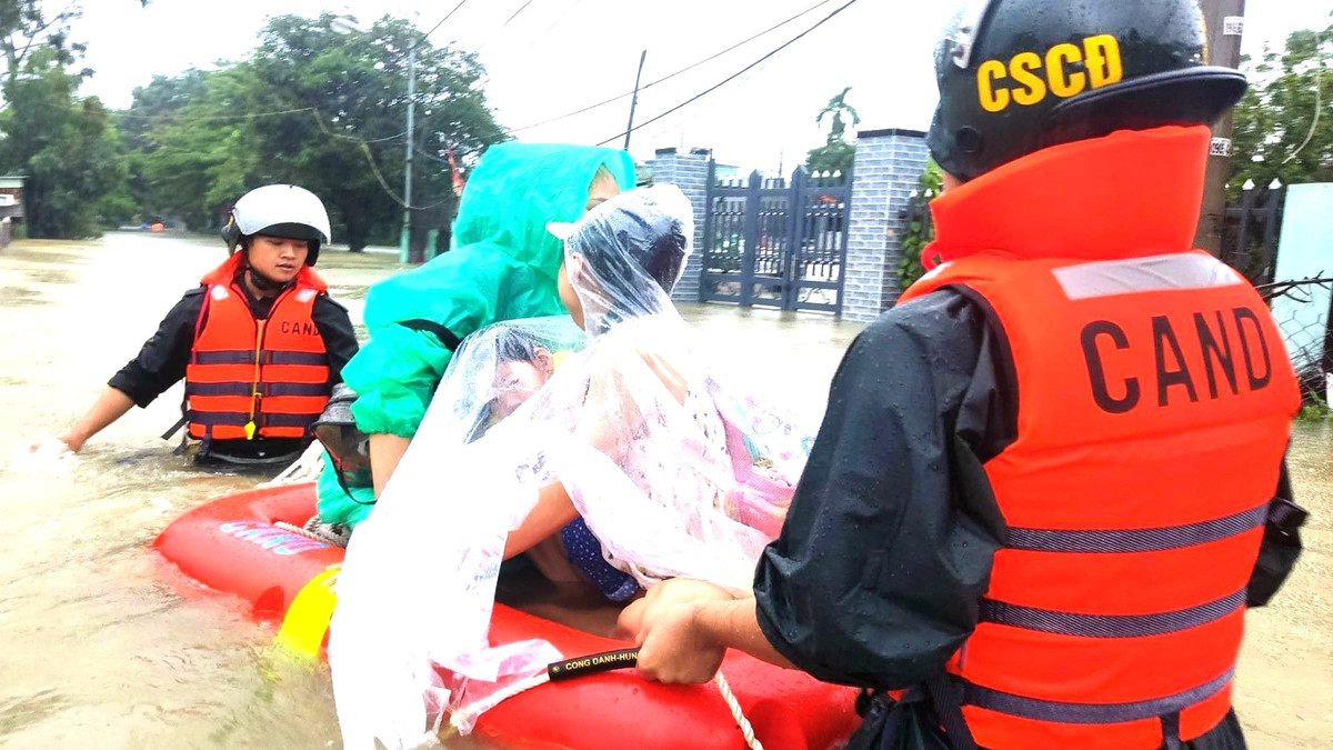 Lực lượng công an ngâm mình trong biển nước, xuyên đêm đến từng kiệt, hẻm vùng thấp trũng để ứng cứu, đưa người dân bị mắc kẹt ra ngoài.