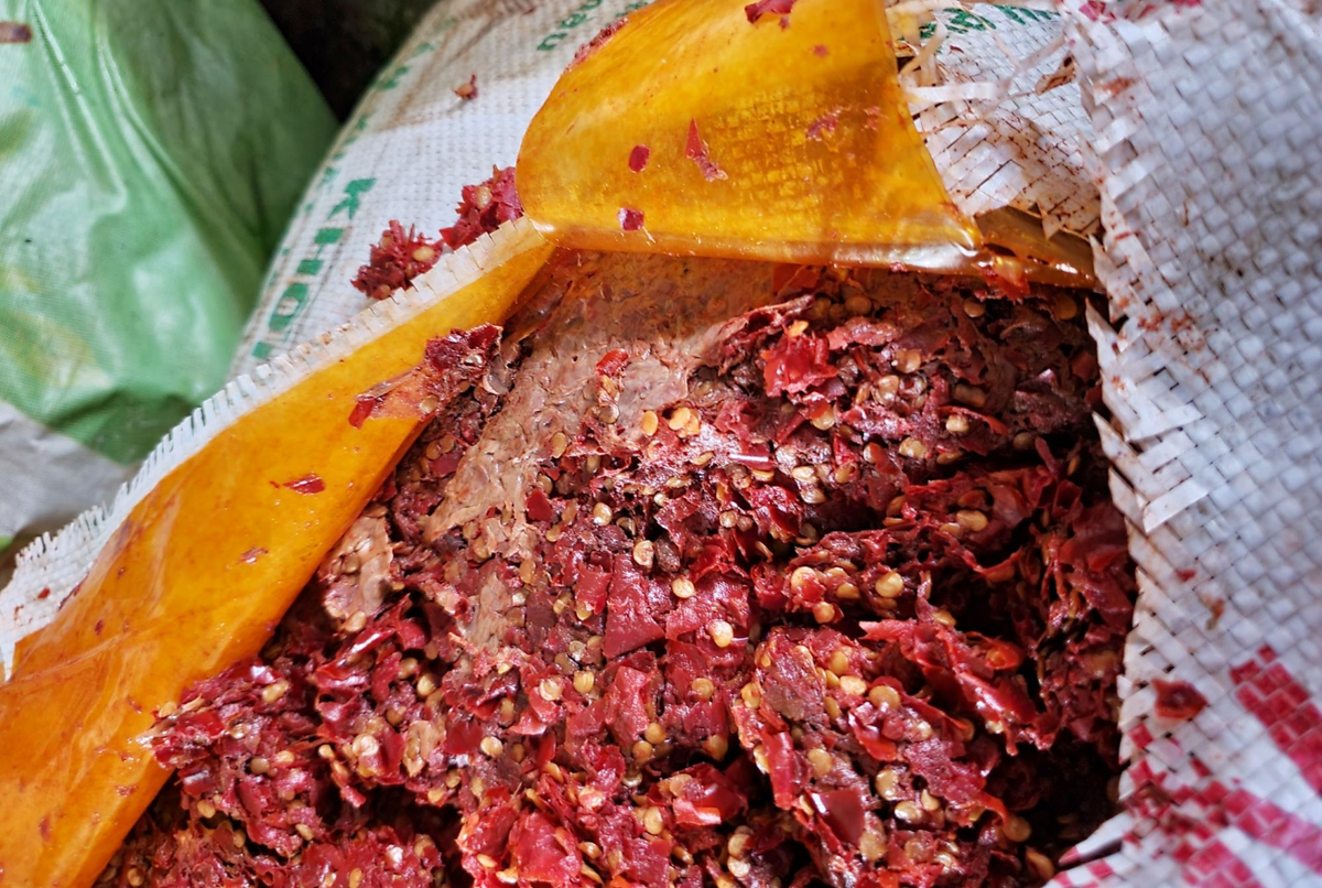 Lực lượng chức năng phát hiện kho hàng nói trên đang tập kết hàng trăm bao tải bên trong chứa tương ớt (không có nhãn hiệu, không có hóa đơn, chứng từ chứng minh nguồn gốc xuất xứ, không có giấy chứng nhận vệ sinh an toàn thực phẩm) tổng trọng lượng khoảng 15 tấn đang bốc mùi hôi thối nồng nặc.