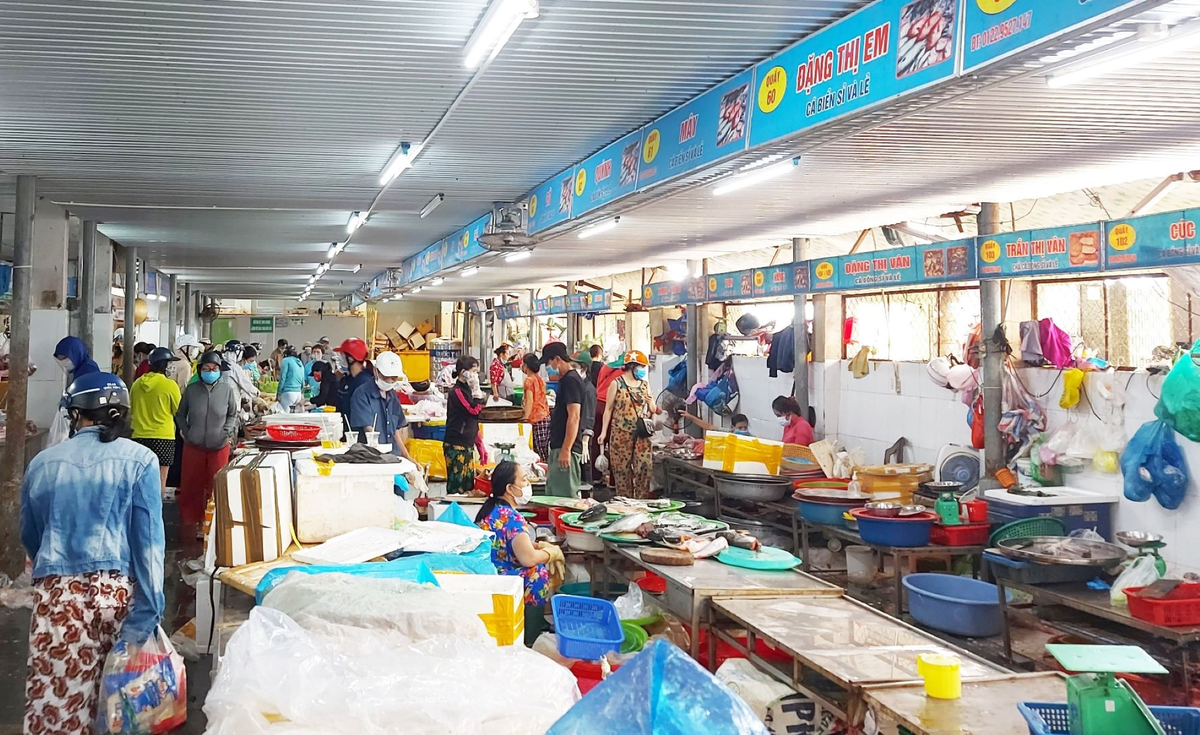 Tại chợ Khuê Mỹ (phường Khuê Mỹ, quận Ngũ Hành Sơn), người dân đi chợ cũng khá đông nên những quầy bày bán hàng thiết yếu như rau củ, thịt cá hết rất nhanh.