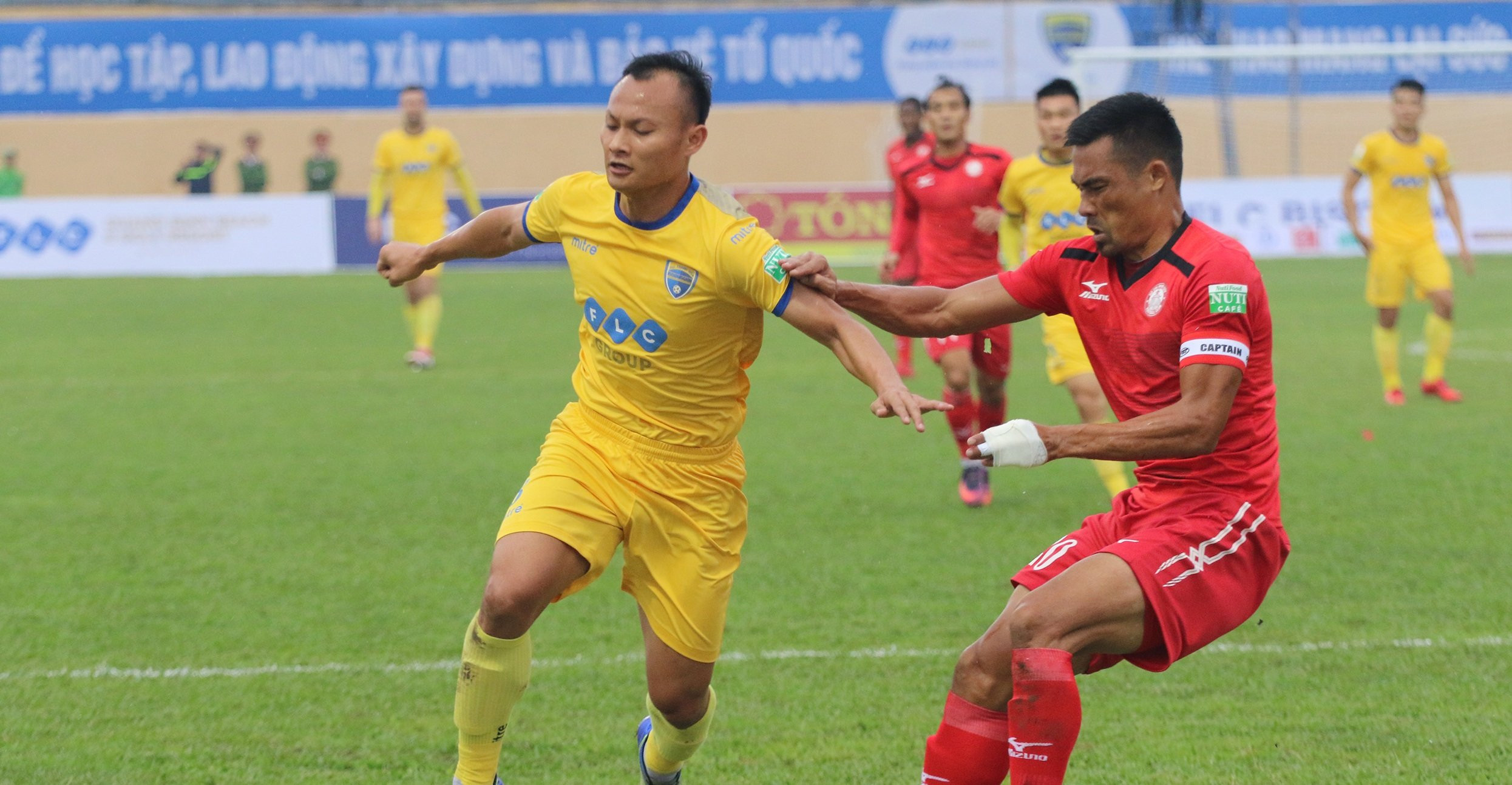 Đình Luật (áo đỏ) bị treo giò 3 trận.