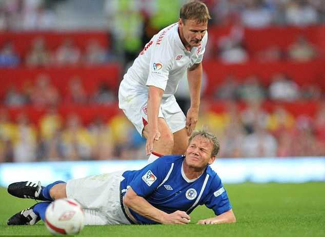 | Sheringham quên mất rằng anh đang tham dự trận cầu giao hữu giữa cựu ngôi sao tuyển Anh - Phần còn lại của Thế giới. |
