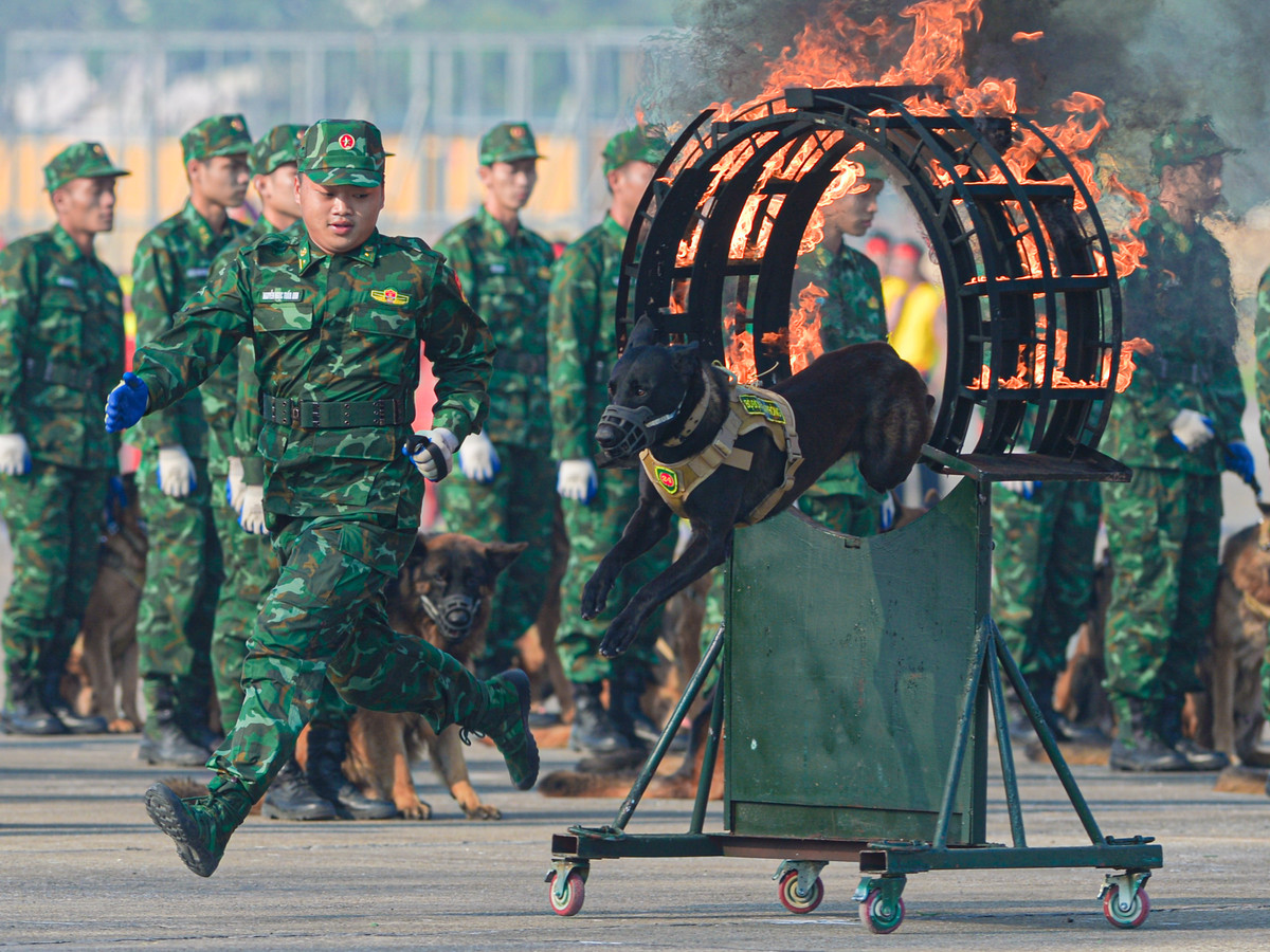 Bộ đội biên phòng sử dụng 80 quân khuyển cùng 80 huấn luyện viên tham gia trình diễn.