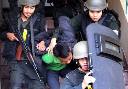 | Cảnh sát cơ động trấn áp kẻ khống chế con tin tại quận 12. Ảnh: Hồng Phúc. |