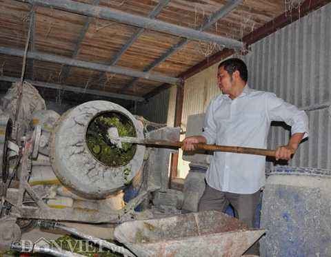 | Anh Nguyễn Đăng Cường đang chế biến thức ăn gồm rau xanh, ngô… cho vịt trời sạch |